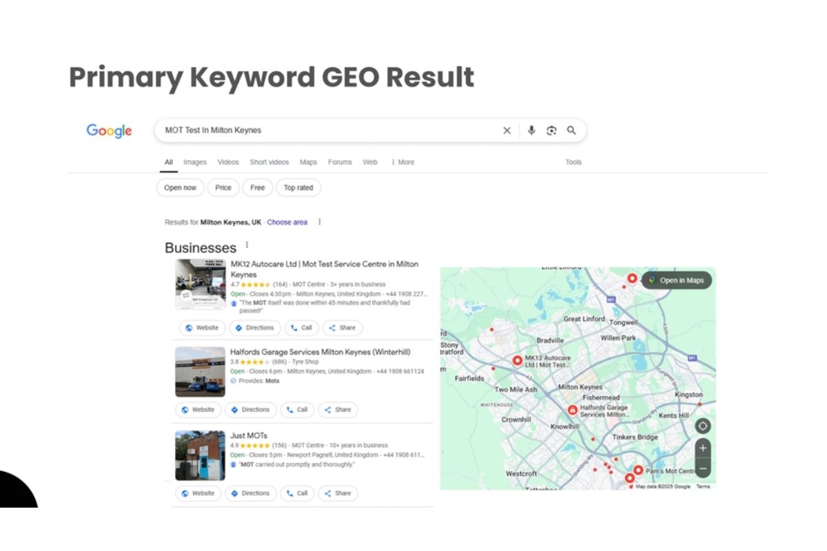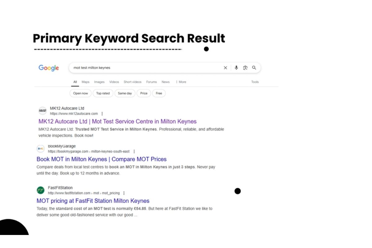 Improved Google search rankings for primary keywords like “MOT Test Milton Keynes”, “Car Service Milton Keynes”, and other related terms, positioning the brand on the first page of Google for competitive searches.