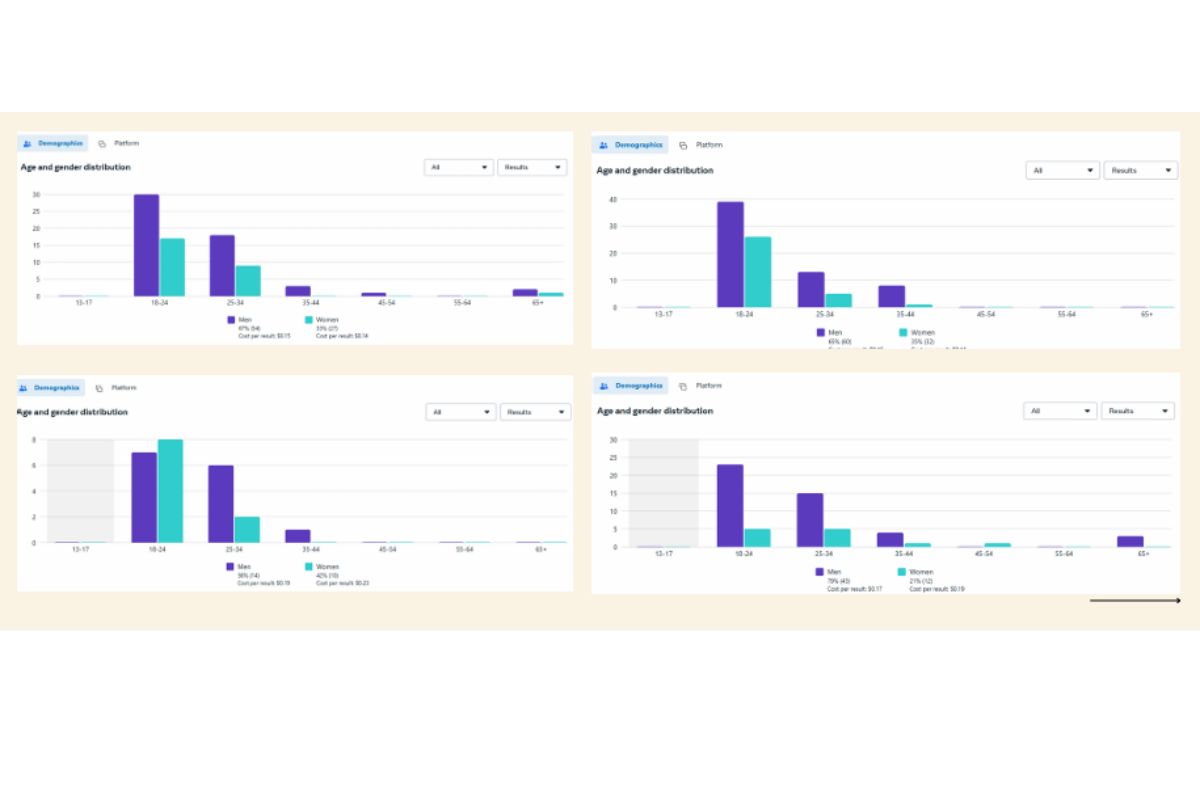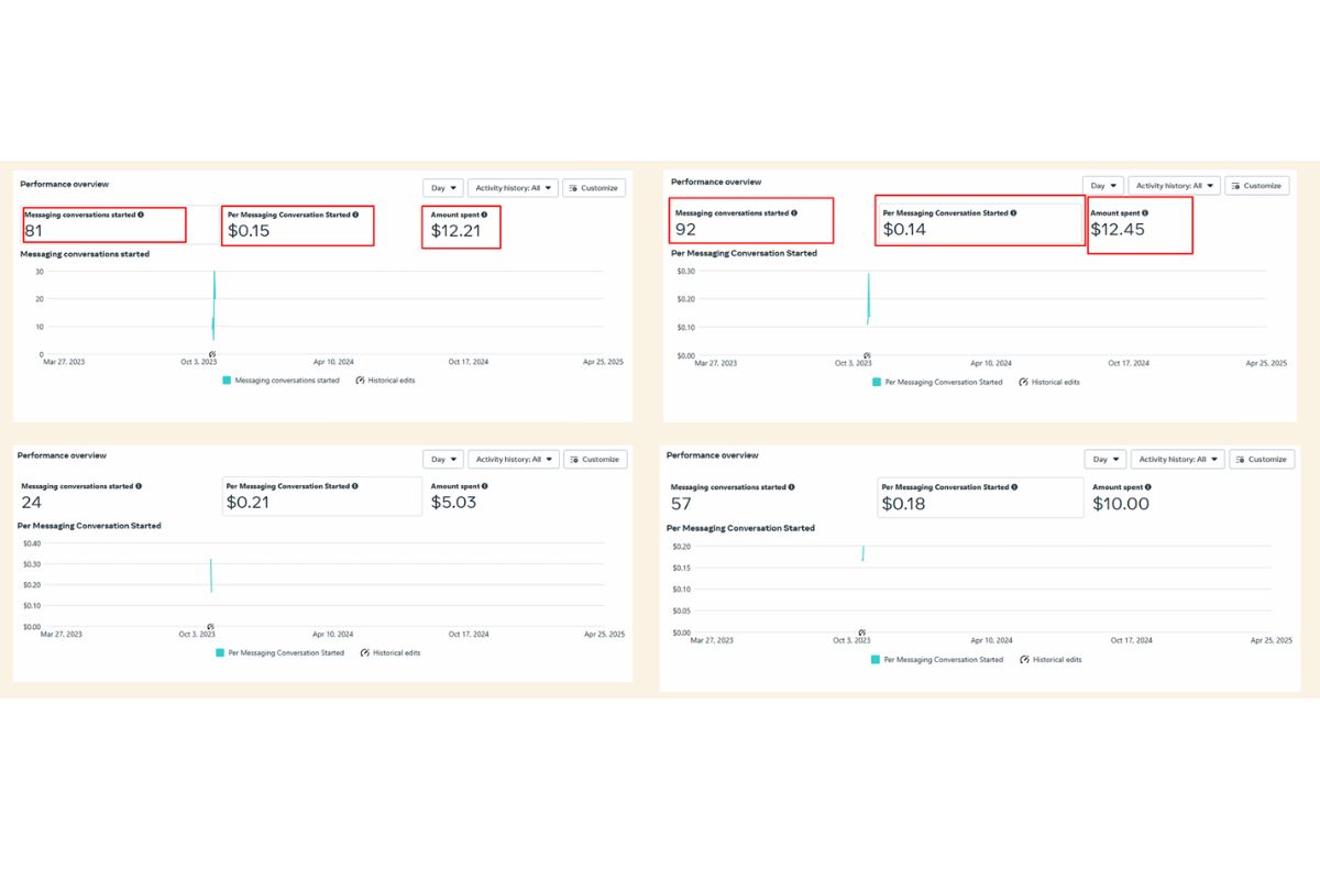 Generated 24 messaging conversations with a total spend of $5.03, leading to the highest cost per conversation at $0.21.Scenario 4 (Bottom-Right)